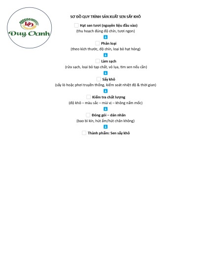 Sen sấy khô là sản phẩm được sản xuất bởi Hợp tác xã Duy Oanh, chế biến từ hạt sen tươi tuyển chọn thu hoạch khi hạt đạt độ chín vừa phải, đảm bảo độ tươi ngon và giá trị dinh dưỡng cao. Sản phẩm được thực hiện theo quy trình phân loại, làm sạch và sấy khô có kiểm soát, giúp giữ nguyên màu sắc tự nhiên, mùi thơm đặc trưng và vị bùi béo của hạt sen, đồng thời kéo dài thời gian bảo quản mà không sử dụng chất bảo quản.