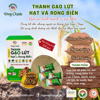 Thanh gạo lứt hạt & rong biển là sản phẩm dinh dưỡng được sản xuất bởi Hợp tác xã Duy Oanh, kết hợp hài hòa giữa gạo lứt đỏ quê giàu chất xơ cùng rong biển Cù Lao Chàm và các loại hạt tự nhiên như mè trắng, hạnh nhân, hạt điều, hạt bí xanh, tạo nên hương vị thơm ngon, giòn bùi và giàu giá trị dinh dưỡng. Sản phẩm sử dụng mật ong làm chất kết dính tự nhiên, không chỉ giúp tăng hương vị mà còn mang lại sự an toàn và lành mạnh cho người sử dụng.