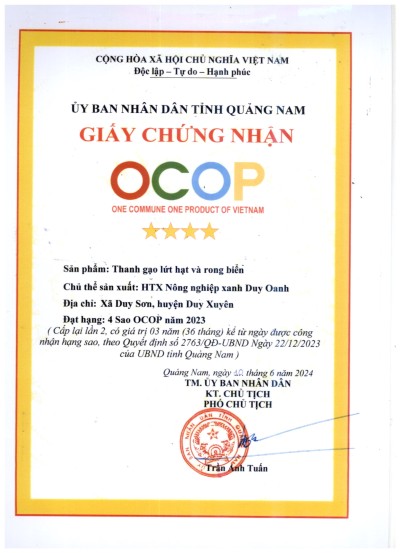 Với quy trình sản xuất đảm bảo an toàn vệ sinh thực phẩm, nguồn nguyên liệu rõ ràng và chất lượng ổn định, Thanh gạo lứt hạt & rong biển Hợp tác xã Duy Oanh đã được công nhận là sản phẩm OCOP 4 sao, khẳng định uy tín và giá trị đặc trưng của sản phẩm địa phương. Đây là lựa chọn phù hợp cho bữa ăn nhẹ, bổ sung năng lượng lành mạnh cho người làm việc, học tập và những người quan tâm đến chế độ ăn uống cân bằng.